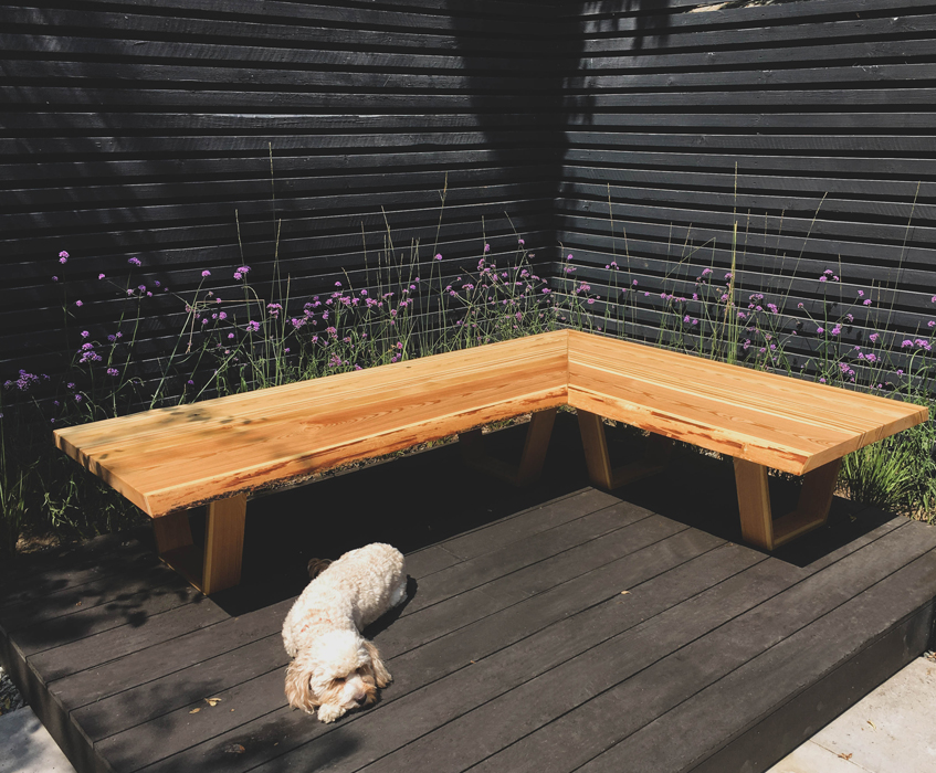 Taking advantage of these factors, we designed it to feel like a courtyard. For a welcoming entrance from the kitchen into the garden, a raised decked area at the same level as the kitchen floor was constructed. Stepping down from that into the centre of it, we arrive at the dining area which feels nestled into the garden.