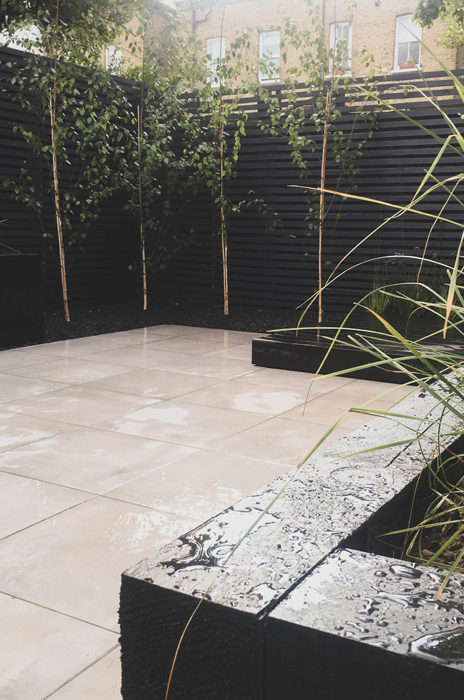 To the back, and one level up is a lounge area. Both sides are hugged by raised planters with tall grasses, spring bulbs and wildflowers. Silver birch line a corner to the back for a greater sense of enclosure and a strong sculptural presence throughout the year.