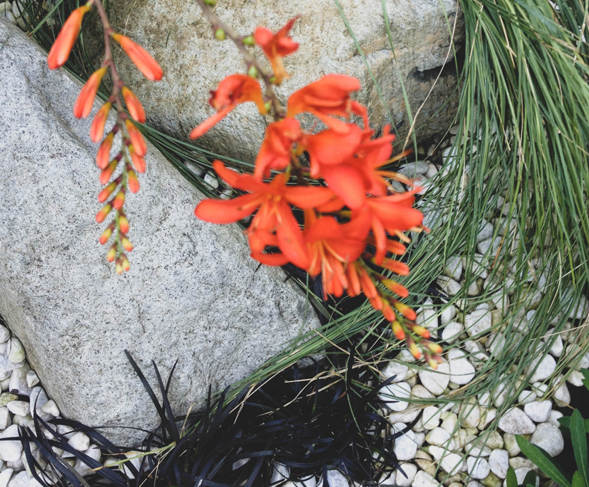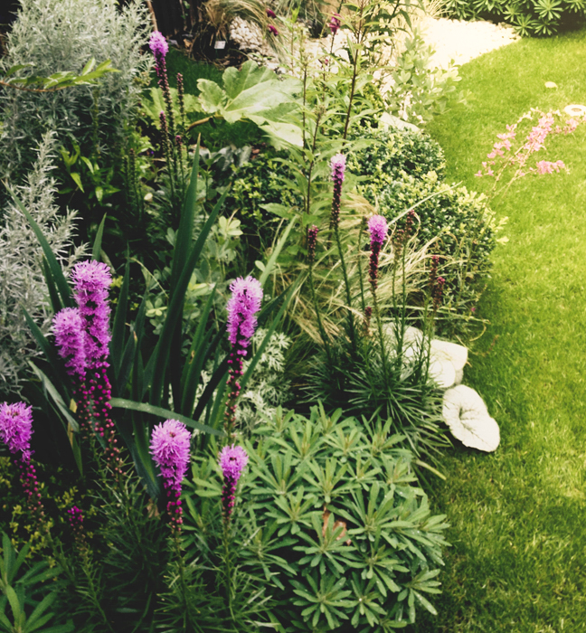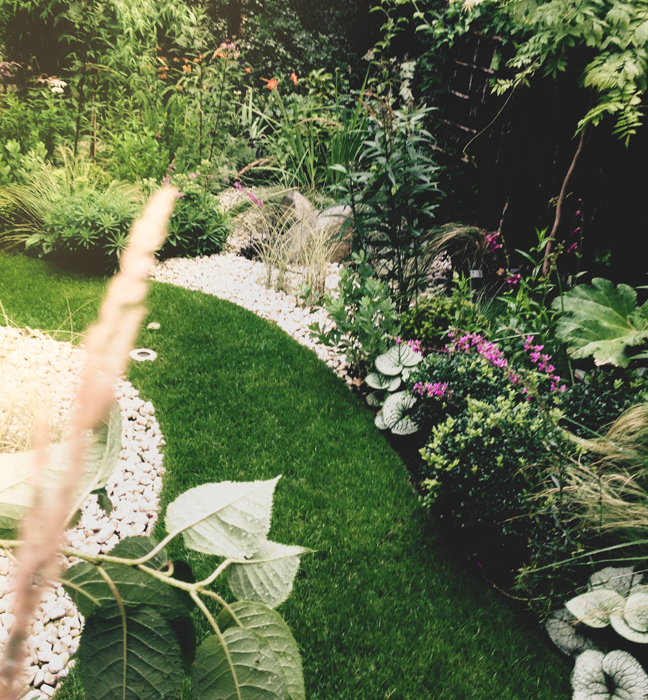 The planting is a tapestry of evergreens and perennials with annuals and bulbs dotted between these. A tall bamboo grove at the bottom of the garden creates a transition into the woodland. A gunnera introduces an element of wilderness and surprise. Two columnar prunus trees and an acer help to settle the garden into its woodland surroundings. Plenty of insect-friendly plants draw bees and other wildlife into the garden.