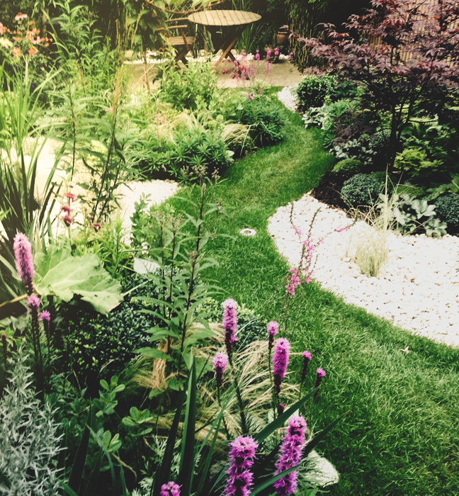 Defined by flowing, curvilinear shapes, the garden invites a visitor to venture down a meandering path towards the woods that lie beyond. The boundaries were kept indistinct to allow the woodland to become a part of the garden. The curved shapes wrap around each other forming a striking pattern when viewed from the top floor of the house.